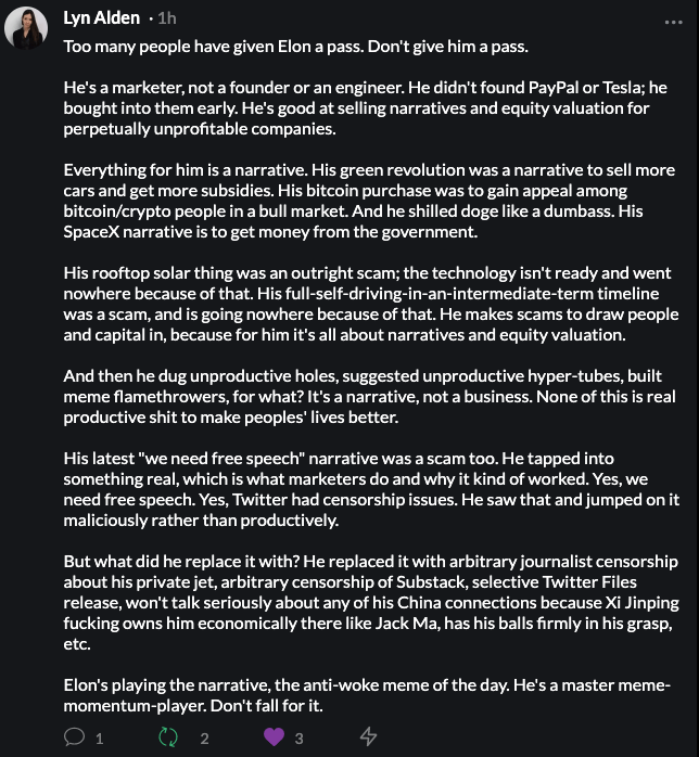 Lyn makes VERY valid points about Musk: