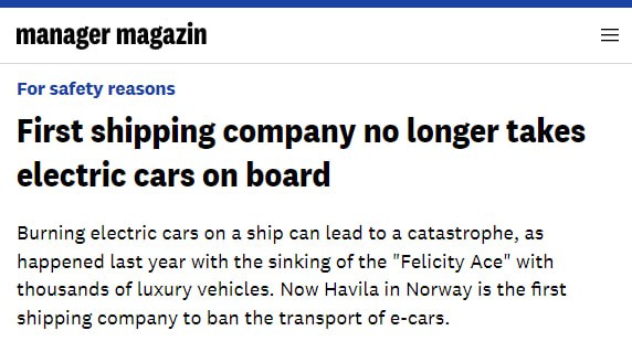 Norwegian shipping company bans the transport of electric vehicles due to fire safety concerns.
