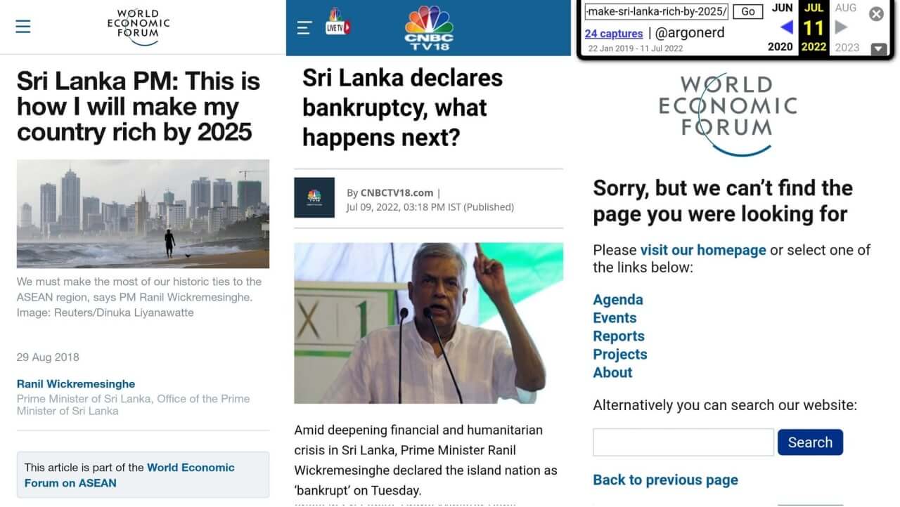 NEW – World Economic Forum deleted a 2018 article by the Prime Minister of Sri Lanka in which he stated that he wanted to “make Sri Lanka rich by 2025” with a “social market economy that delivers economic dividends for all”.